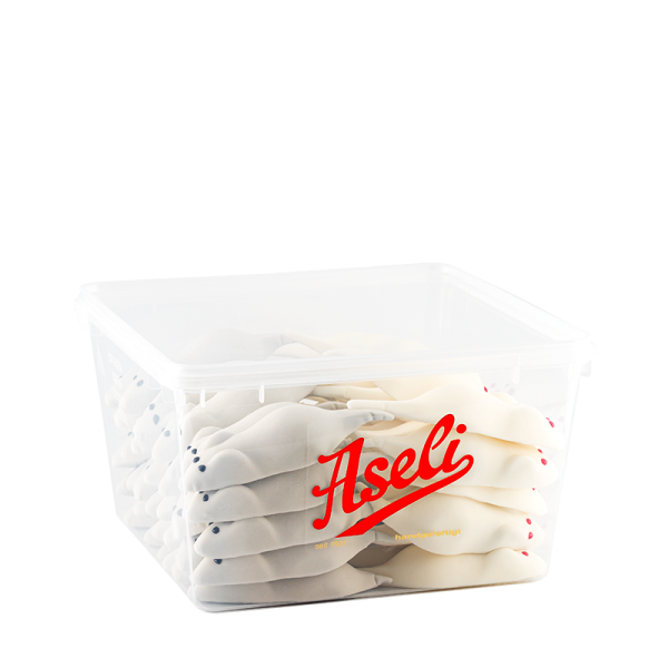 Aseli es una empresa familiar de tercera generación. Las figuras de malvavisco se fabrican en Berlín siguiendo antiguas recetas familiares. Cocidos, inyectados y envasados a mano desde 1921, los ratones gigantes Aseli no contienen gluten ni lactosa y sólo contienen colorantes y aromas naturales.